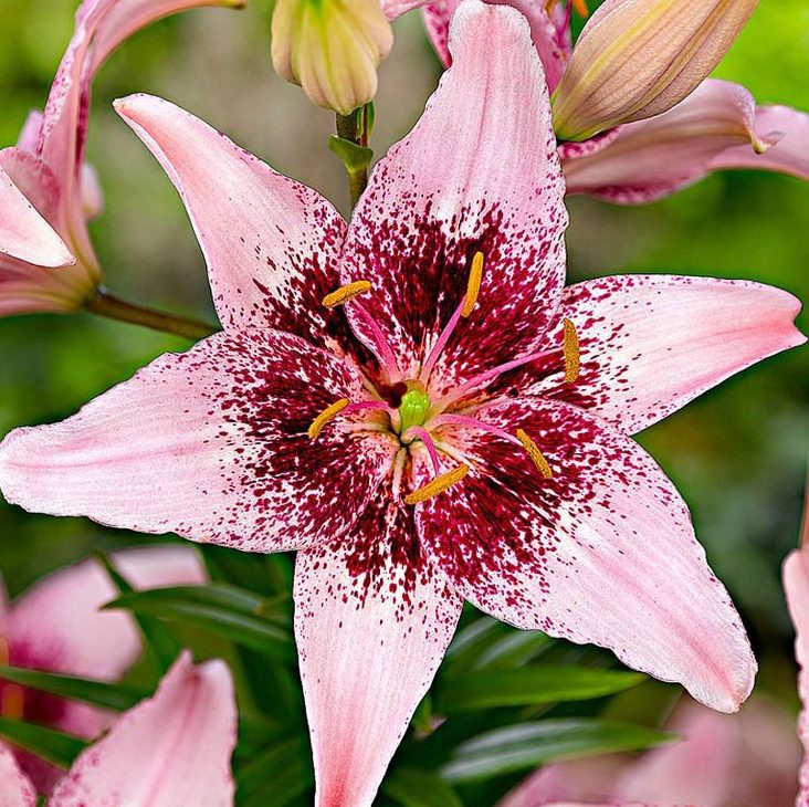 Окраска цветка : светло-розовый, многочисленные пурпурные крапинки на лепестках вокруг центра