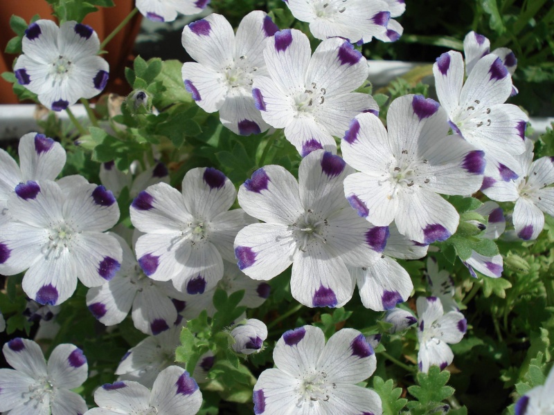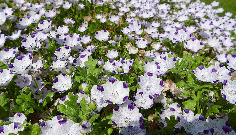 Семена немофилы пятнистой (Nemophila maculata) Божья коровка высевают в открытый грунт в апреле, и уже в июне любуются красивоцветущей полянкой. Однолетнее почвопокровное растение низкое, высотой до 20 сантиметров. Стебли разветвленные, полустелющиеся. Листья перистолопастные, опушенные. Нежные цветки немофилы пятнистой похожи на крупные лютики. На конце каждого белого лепестка имеется по одному синему или лиловому пятнышку, отсюда и оригинальное название сорта — «Божья коровка». Любит полутень и влажную почву. Особенно эффектна в бордюрах, в подвесных контейнерах и вблизи водоемов.