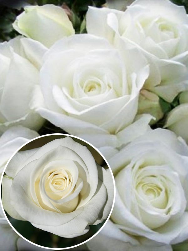 Цветок: чисто белый до голубоватого, чашевидный, с высоким центром, махровый, 20 - 30 лепестков в одном цветке. .Цветки красиво сочетаются с темно-зелеными крупными листьями. Роза может использоваться на срез, долго сохраняет свежесть в букете. Зимостойкость средняя, на зиму требует укрытия.
