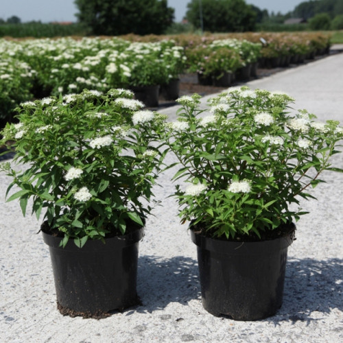 Неприхотливые саженцы спиреи Альбифлора будут отлично смотреться в сочетании с хвойными кустарниками и спиреями другой расцветки.